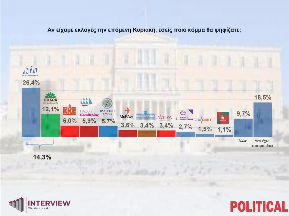 Στην ερώτηση «Αν είχαμε εκλογές την επόμενη Κυριακή, ποιο κόμμα θα ψηφίζατε;» (χωρίς τα κόμματα Καρυστιανού – Τσίπρα), η ΝΔ προηγείται με διαφορά 14,3 μονάδων έναντι του ΠΑΣΟΚ.