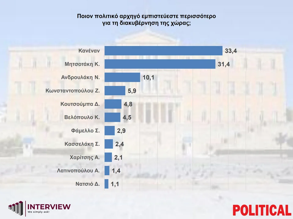 Στην ερώτηση «Ποιον πολιτικό αρχηγό εμπιστεύεστε περισσότερο για τη διακυβέρνηση της χώρας;», «Κανέναν» επέλεξε το 33,4% και ακολουθούν ο Κυριάκος Μητσοτάκης με 31,4%, ο Νίκος Ανδρουλάκης με 10,1%, η Ζωή Κωνσταντοπούλου με 5,9%, ο Δημήτρης Κουτσούμπας με 4,8%, ο Κυριάκος Βελόπουλος με 4,5%, ο Σωκράτης Φάμελλος με 2,9%, ο Στέφανος Κασσελάκης με 2,4%, ο Αλέξης Χαρίτσης με 2,1%, η Αφροδίτη Λατινοπούλου με 1,4% και ο Δημήτρης Νατσιός με 1,1%.