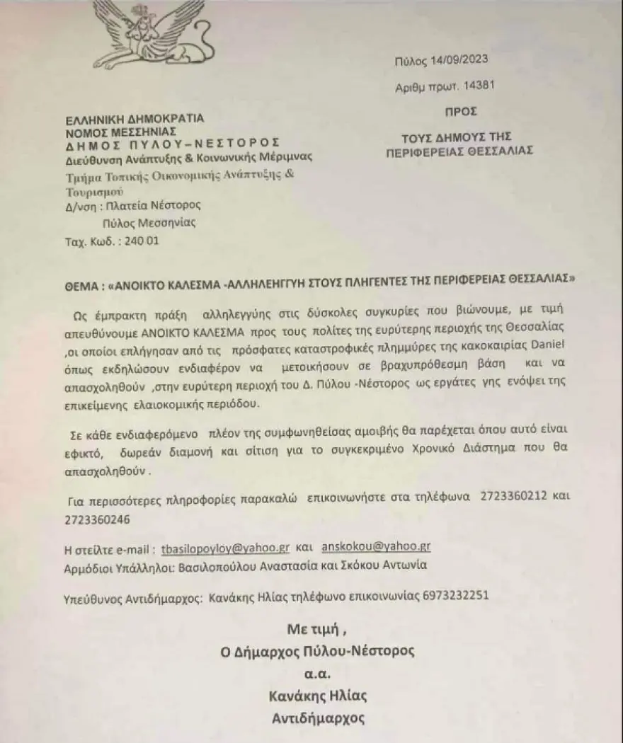 Ο Ηλίας Κανάκης, αντιδήμαρχος Πύλου-Νέστορος υπέγραψε επίσημο χαρτί του δήμου απευθυνόμενος στους δήμους της Θεσσαλίας καλώντας τους πληγέντες οι οποίοι θρηνούν συγγενείς, φίλους και περιουσίες να πάνε για εργάτες γης για λίγο στην περιοχή μιλώντας μάλιστα και για δωρεάν σίτιση, όπου είναι δυνατόν.