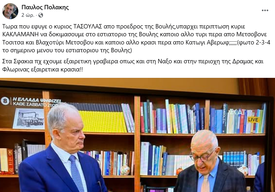 Ο βουλευτής Χανίων του ΣΥΡΙΖΑ Παύλος Πολάκης με ανάρτησή του τρολάρει την… επιλογή του πρώην Προέδρου της Βουλής και επερχόμενου Προέδρου της Δημοκρατίας Κώστα Τασούλα να επιβάλει μόνο προϊόντα από τον τόπο καταγωγής του στο εστιατόριο της Βουλής.