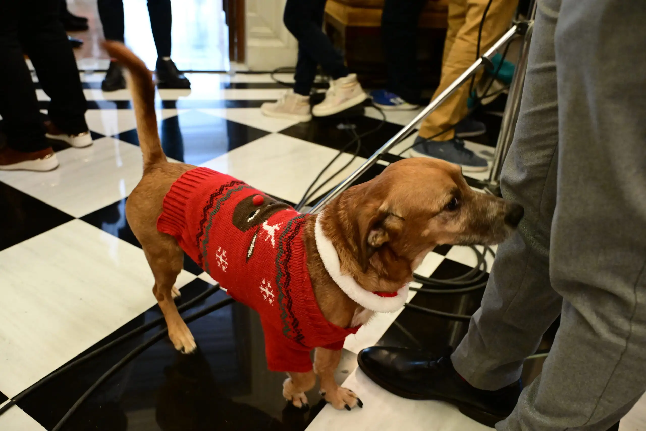 Ο Πίνατ ντύθηκε… Άγιος Βασίλης και «έκλεψε» την παράσταση στο Μέγαρο Μαξίμου το πρωί της Τρίτης (24/12) όπου ο πρωθυπουργός Κυριάκος Μητσοτάκης άκουσε τα κάλαντα των Χριστουγέννων από το Λύκειο των Ελληνίδων, το Σώμα Ελληνικού Οδηγισμού και το Μουσικό Σχολείο Πτολεμαΐδας.