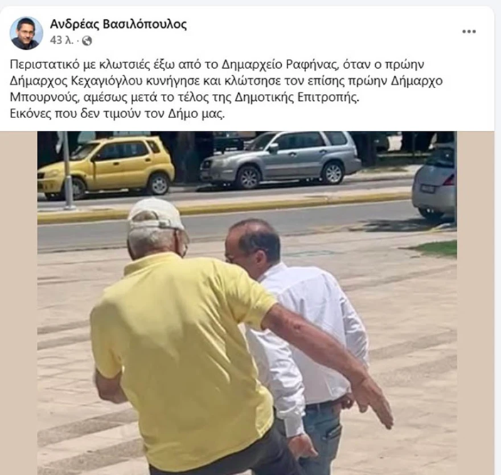 «Περιστατικό με κλωτσιές έξω από το Δημαρχείο Ραφήνας, όταν ο πρώην Δήμαρχος Κεχαγιόγλου κυνήγησε και κλώτσησε τον επίσης πρώην Δήμαρχο Μπουρνούς, αμέσως μετά το τέλος της Δημοτικής Επιτροπής.