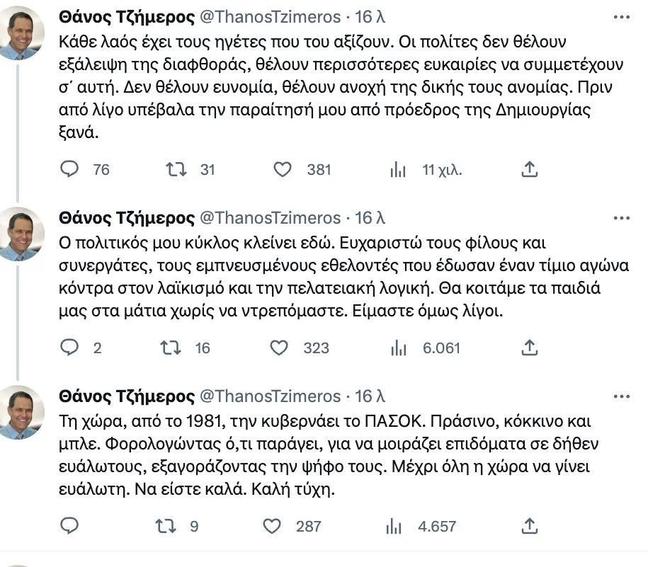 Την ανακοίνωσε έκανε ο ίδιος ο Θάνος Τζήμερος μέσω Twitter.