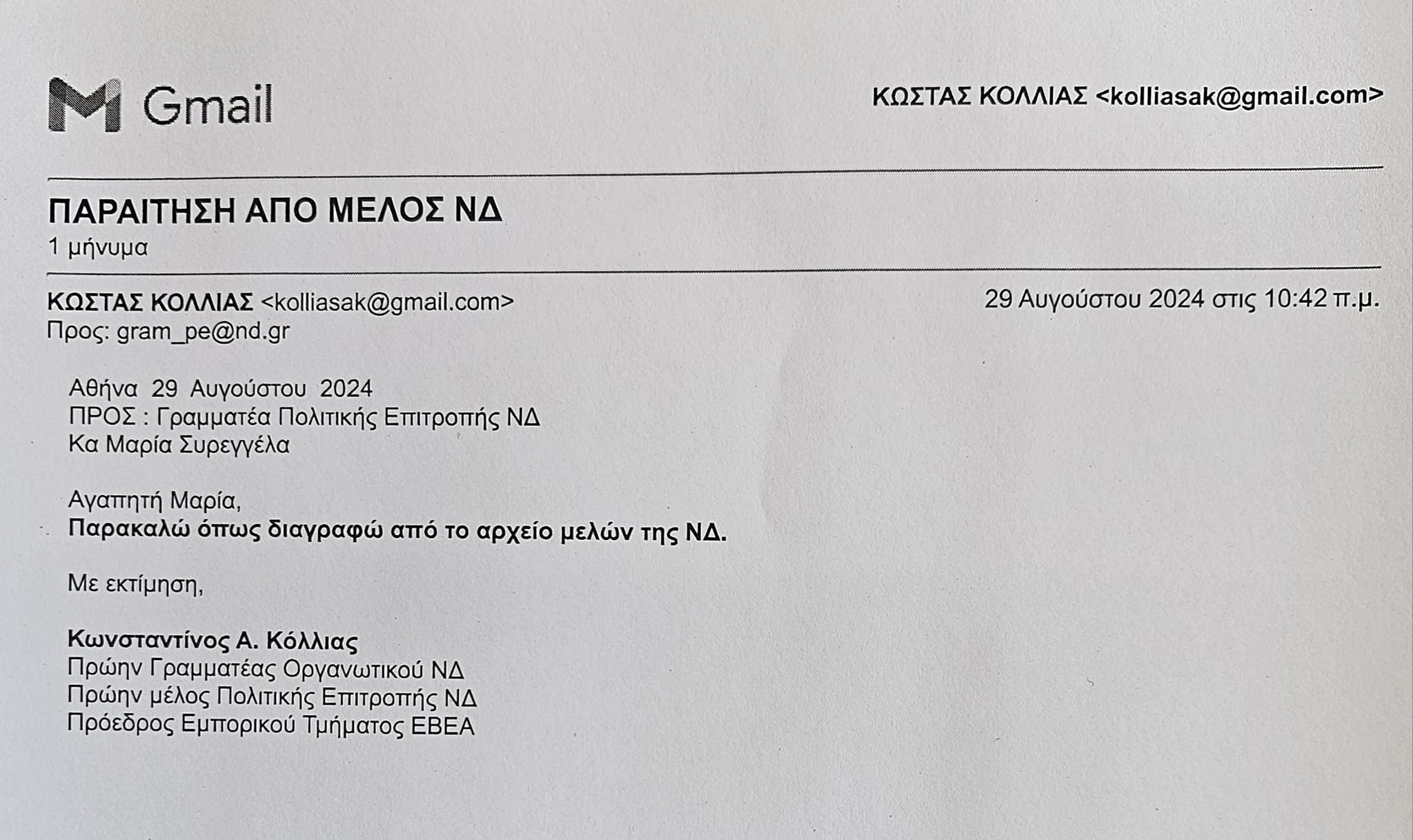 Την παραίτησή του από μέλος της ΝΔ ανακοίνωσε ο Κώστας Κόλλιας μέλος του ΔΣ στο Βιομηχανικό Επιμελητήριο Αθηνών (ΕΒΕΑ).