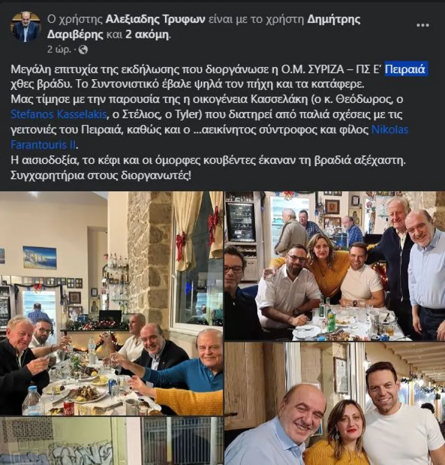 Η οικογένεια Κασσελάκη έδωσε το παρών στην εκδήλωση που διοργάνωσε το βράδυ του Σαββάτου (16/12) η ΟΜ ΣΥΡΙΖΑ Ε’ Πειραιά.