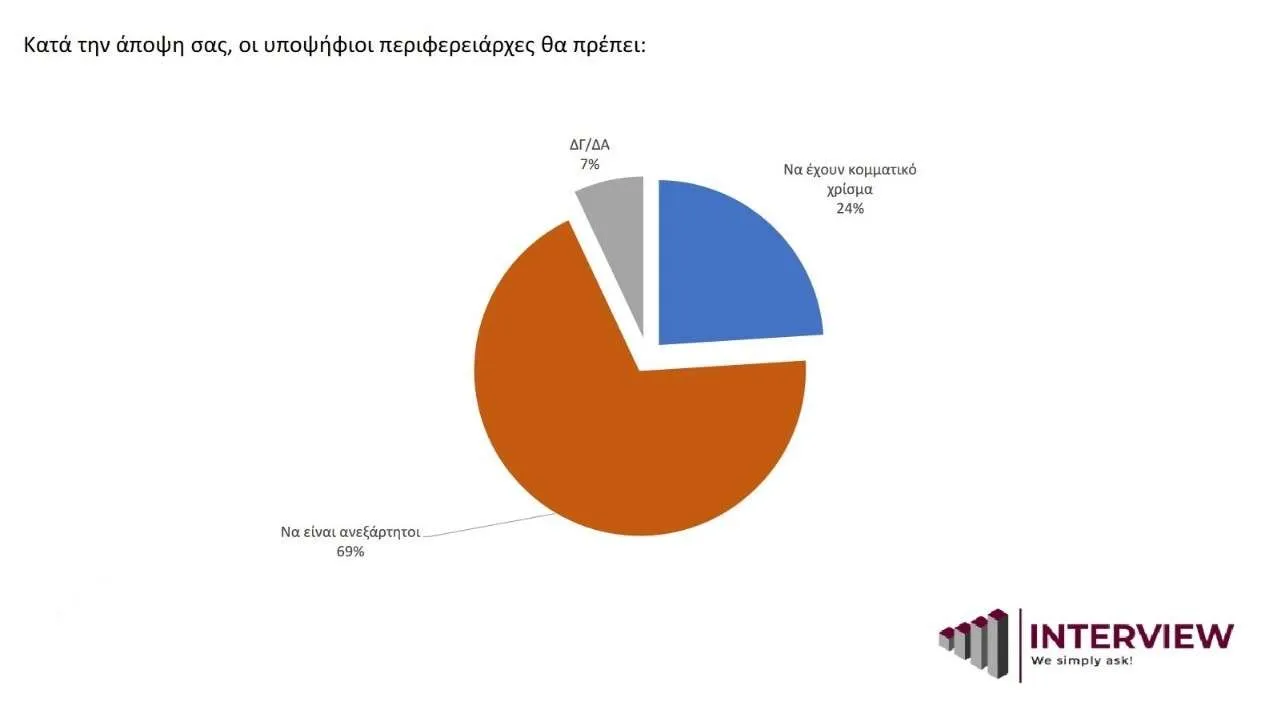 Σημειώνεται, καταληκτικά ότι σε δημοσκόπηση της INERVIEW, το 69% των πολιτών της Περιφέρειας Κεντρικής Μακεδονίας πιστεύουν πως οι υποψήφιοι Περιφερειάρχες πρέπει να είναι Ανεξάρτητοι.