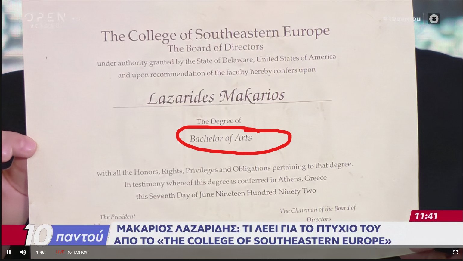 Σήμερα παρουσίασε ως «πτυχίο» ένα χαρτί του… College of Southeastern Europe, ένα από τα IEK της δεκαετίας του ’80!