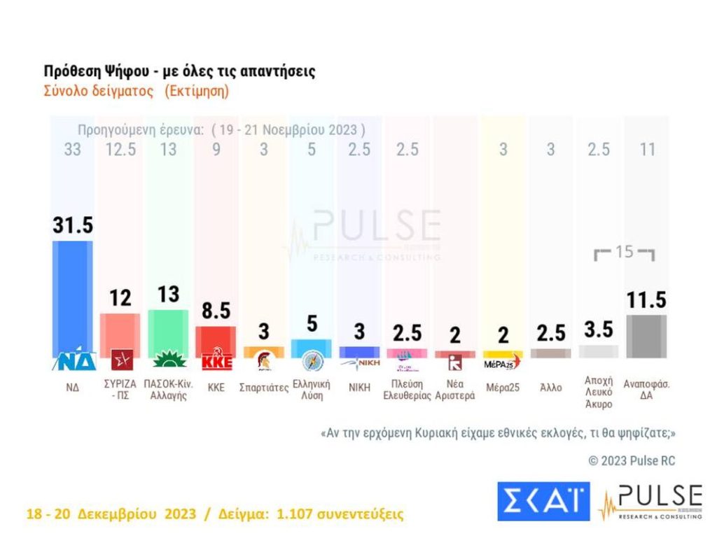 Στη δημοσκόπηση της PULSE, που δημοσιοποιήθηκε στο αποψινό κεντρικό δελτίο του ΣΚΑΪ, Νέα Δημοκρατία και Κυριάκος Μητσοτάκης καταγράφουν υπεροχή έναντι των αντιπάλων τους, ενώ, το ΠΑΣΟΚ – Κίνημα Αλλαγής εδραιώνεται στη δεύτερη θέση, με τον ΣΥΡΙΖΑ – Προοδευτική Συμμαχία να είναι τρίτος.