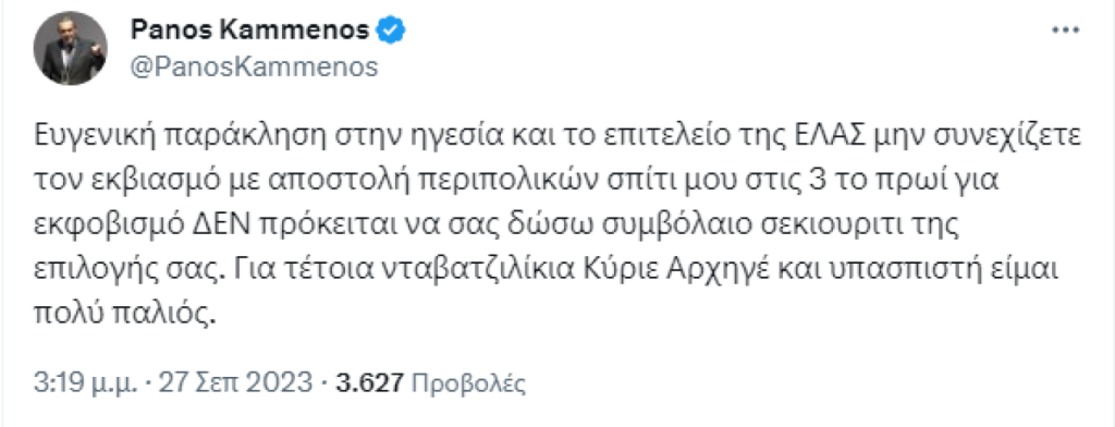 Ο κ. Καμμένος κατήγγειλε στον λογαριασμό του στο Twitter ότι είναι θύμα εκβιασμού και εκφοβισμού από την Αστυνομία ενώ σήμερα επανήλθε στο ίδιο ζήτημα συνδυάζοντας το με τις εξαγγελίες του Κ.Μητσοτάκη για μείωση της προστασίας σημαντικών προσώπων και ουσιαστικά προώθησης συμφερόντων εταιρειών security.