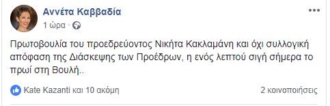 Με ανάρτησή της στο Facebook η κ. Καββαδία, δεν έκρυψε την ενόχλησή της για την συγκεκριμένη απόφαση κάνοντας λόγο για ”πρωτοβουλία του προεδρεύοντος Νικήτα Κακλαμάνη και όχι συλλογική απόφαση της Διάσκεψης των Προέδρων, η ενός λεπτού σιγή σήμερα το πρωί στη Βουλή”.