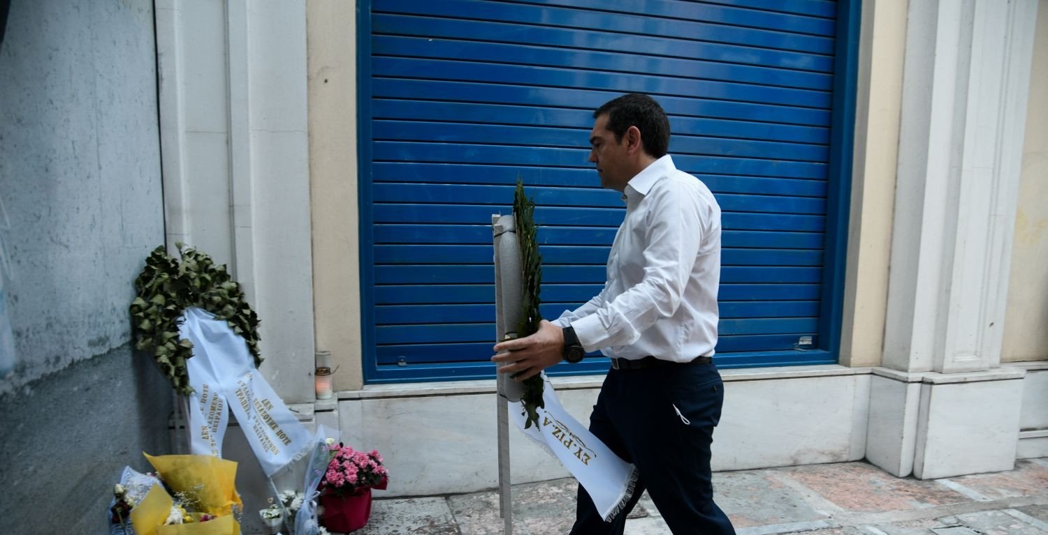 Ο αρχηγός του ΣΥΡΙΖΑ, Αλέξης Τσίπρας, κατέθεσε λίγο μετά τις 9.30 το πρωί στεφάνι στη Marfin, αποτίοντας φόρο τιμής στους νεκρούς.