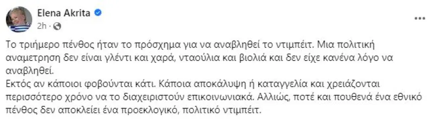 «Το τριήμερο πένθος ήταν το πρόσχημα για να αναβληθεί το debate. Μια πολιτική αναμετρηση δεν είναι γλέντι και χαρά, νταούλια και βιολιά και δεν είχε κανένα λόγο να αναβληθεί. Εκτός αν κάποιοι φοβούνται κάτι. Κάποια αποκάλυψη ή καταγγελία και χρειάζονται περισσότερο χρόνο να το διαχειριστούν επικοινωνιακά. Αλλιώς, ποτέ και πουθενά ένα εθνικό πένθος δεν αποκλείει ένα προεκλογικό, πολιτικό debate» γράφει χαρακτηριστικά.