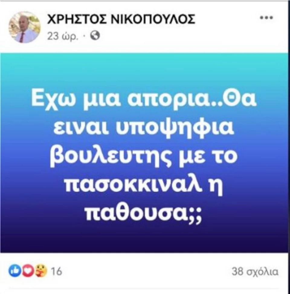 Παραιτήθηκε από μέλος της Γραμματείας της Νομαρχιακής Επιτροπής Μαγνησίας του ΣΥΡΙΖΑ ο Χρήστος Νικόπουλος, μετά από μία σειρά αναρτήσεων που έκανε τις προηγούμενες ημέρες για την καταγγελία της Ελένης Χρονοπούλου σχετικά με τον βιασμό και την κακοποίηση από τον Αλέξη Γεωργούλη.