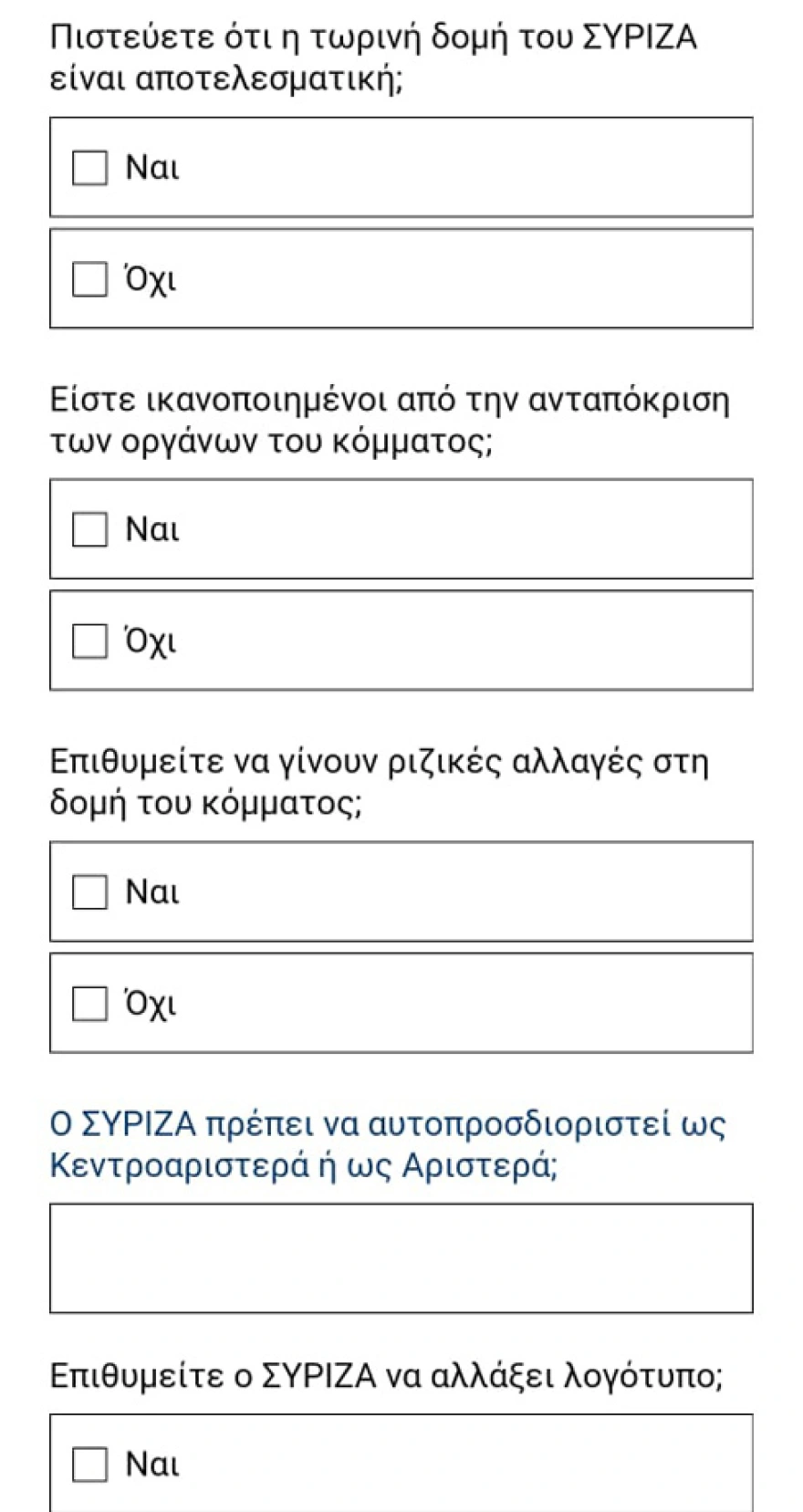 Ακόμη, ζητείται από τα μέλη του κόμματος να τοποθετηθούν ως προς το εάν η τωρινή δομή του ΣΥΡΙΖΑ είναι αποτελεσματική, αλλά και εάν τα μέλη είναι ικανοποιημένα από την ανταπόκριση των κομματικών οργάνων.