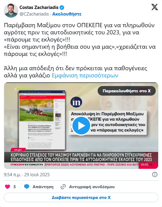 «Παρέμβαση Μαξίμου στον ΟΠΕΚΕΠΕ για να πληρωθούν αγρότες πριν τις αυτοδιοικητικές του 2023, για να “πάρουμε τις εκλογές”!!! “Είναι σημαντική η βοήθεια σου για μας”, “χρειάζεται να πάρουμε τις εκλογές”!!!», γράφει σε ανάρτησή του.