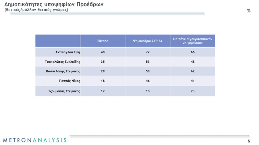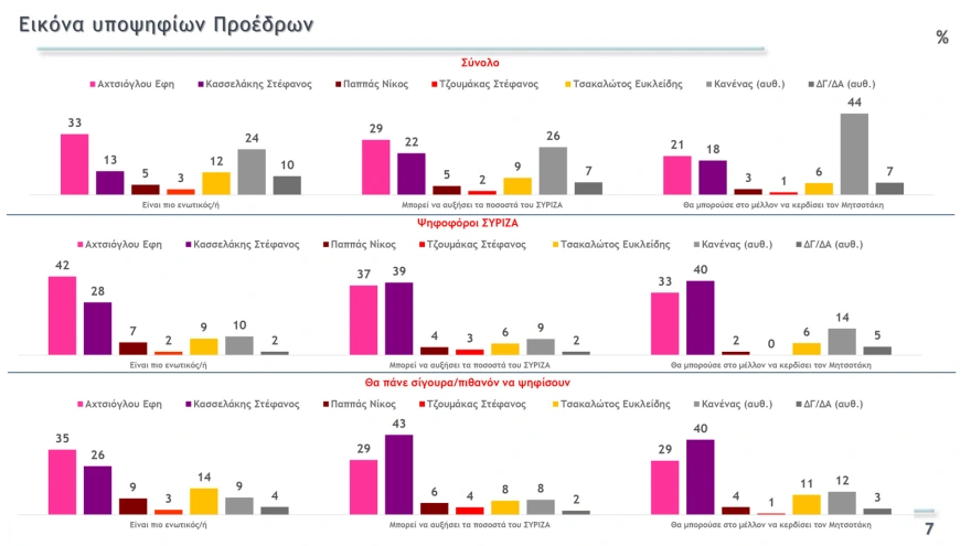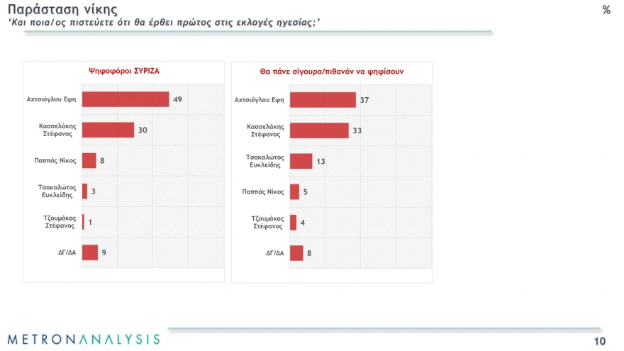 Μεταξύ εκείνων που δηλώνουν ότι θα ψηφίσουν, η Αχτσιόγλου έχει τις περισσότερες θετικές γνώμες – 66% έναντι 62% του κ. Κασσελάκη, ενώ θεωρείται και «πιο ενωτική» με 35% έναντι 26% του κ. Κασσελάκη. Ωστόσο, ο 35χρονος προηγείται με μεγάλη διαφορά (14 και 11 μονάδων αντίστοιχα) στα κρίσιμα ερωτήματα – ποιος μπορεί να αυξήσει τα ποσοστά του ΣΥΡΙΖΑ και ποιος να κερδίσει στο μέλλον τον Κυριάκο Μητσοτάκη.