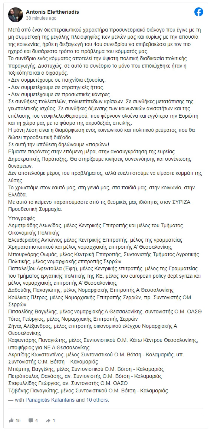 Με αυτό το κείμενο παραιτούμαστε από τις θεσμικές μας ιδιότητες στον ΣΥΡΙΖΑ Προοδευτική Συμμαχία.