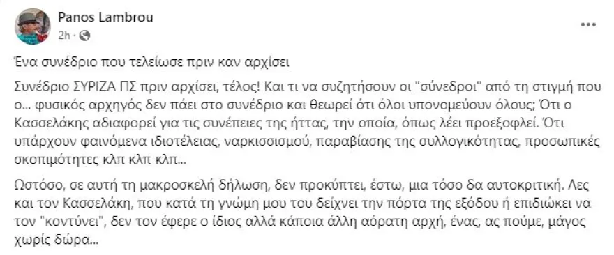 Λίγη ώρα νωρίτερα το πρώην στέλεχος του ΣΥΡΙΖΑ είχε σχολιάσει πως το συνέδριο του κόμματος τέλειωσε πριν καν αρχίσει. Βάζοντας στο στόχαστρο και πάλι τον Αλέξη Τσίπρα είπε πως «σε αυτή τη μακροσκελή δήλωση, δεν προκύπτει, έστω, μια τόσο δα αυτοκριτική. Λες και τον Κασσελάκη, που κατά τη γνώμη μου του δείχνει την πόρτα της εξόδου ή επιδιώκει να τον “κοντύνει”, δεν τον έφερε ο ίδιος αλλά κάποια άλλη αόρατη αρχή, ένας, ας πούμε, μάγος χωρίς δώρα…».