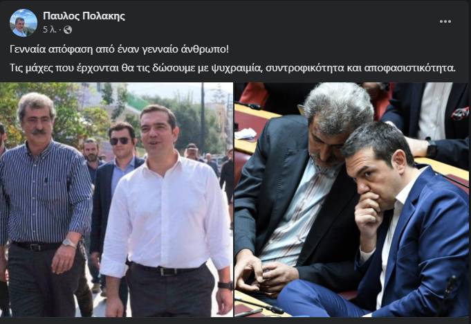 Σε μία πρώτη αντίδρασή του, ο Παύλος Πολάκης με ανάρτησή του στο FB κάνει λόγο για γενναία απόφασή από έναν γενναίο άνθρωπο, ενώ σημειώνει πως τις μάχες που έρχονται θα τις δώσουμε με ψυχραιμία, συντροφικότητα και αποφασιστικότητα.