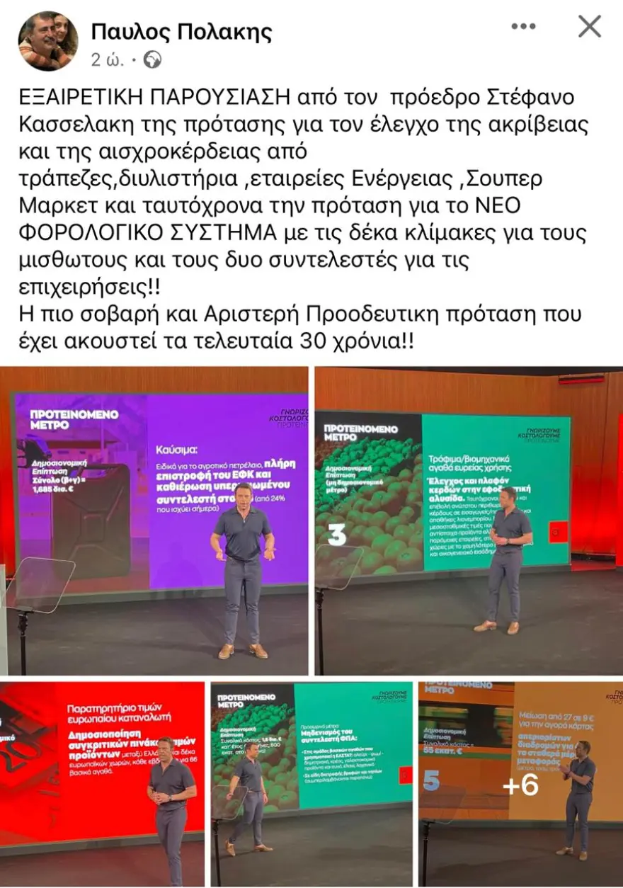 «ΕΞΑΙΡΕΤΙΚΗ ΠΑΡΟΥΣΙΑΣΗ από τον πρόεδρο Στέφανο Κασσελάκη της πρότασης για τον έλεγχο της ακρίβειας και της αισχροκέρδειας από τράπεζες, διυλιστήρια, εταιρείες Ενέργειας, Σουπερ Μαρκετ και ταυτόχρονα την πρόταση για το ΝΕΟ ΦΟΡΟΛΟΓΙΚΟ ΣΥΣΤΗΜΑ με τις δέκα κλίμακες για τους μισθωτούς και τους δυο συντελεστές για τις επιχειρήσεις!! Η πιο σοβαρή και Αριστερή Προοδευτική πρόταση που έχει ακουστεί τα τελευταία 30 χρόνια!!»