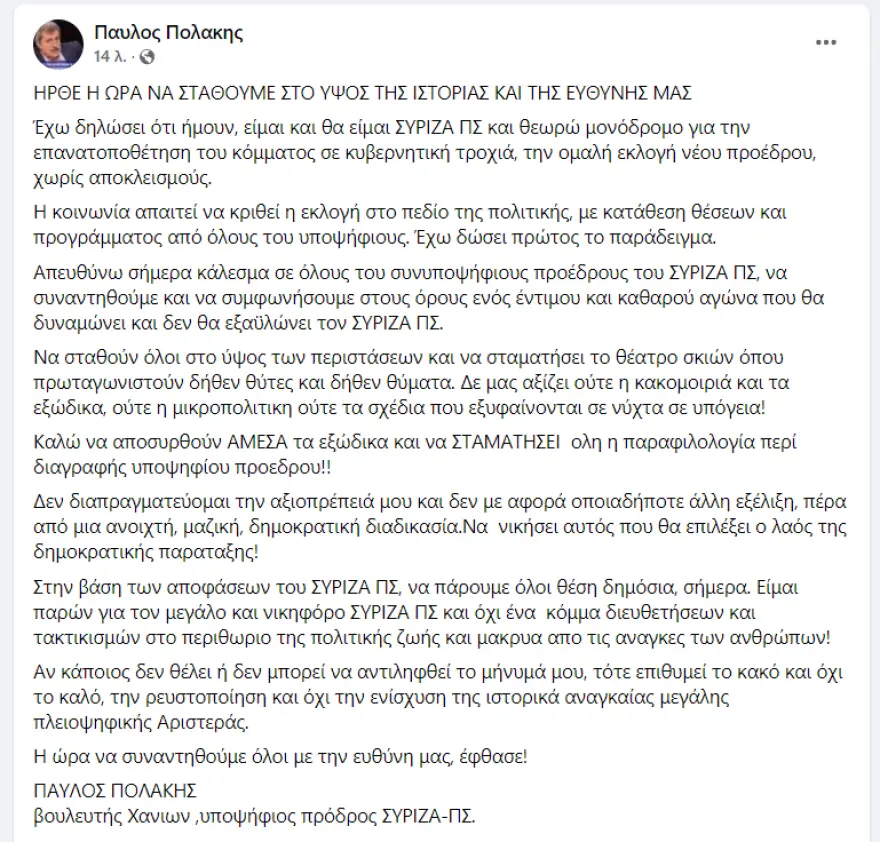Ο Παύλος Πολάκης ζητά με νέα ανάρτησή του στο Facebook, να αποσυρθούν άμεσα τα εξώδικα και να σταματήσει η παραφιλολογία περί διαγραφής υποψηφίου προέδρου.