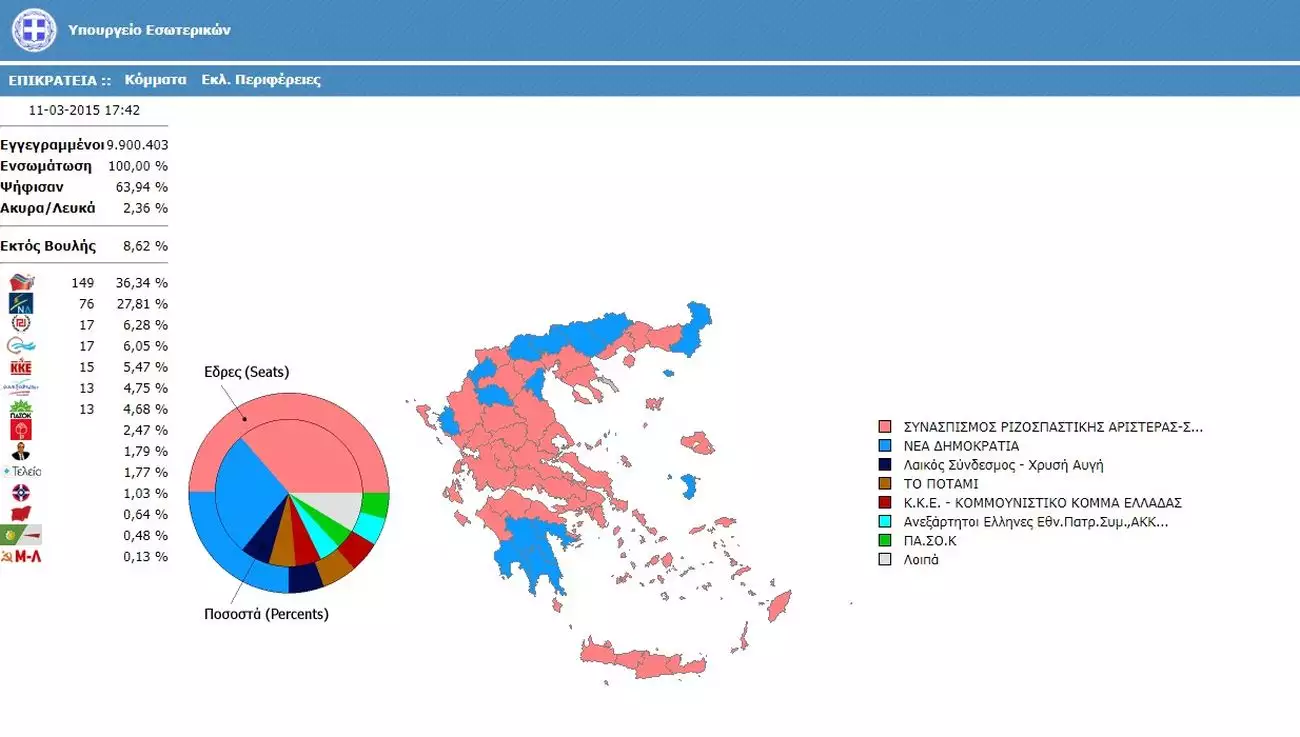 Με βάση τα στοιχεία του υπουργείου Εσωτερικών και με την ενσωμάτωση στο 100% πρώτο κόμμα αναδείχτηκε ο ΣΥΡΙΖΑ με 36,34% και 149 έδρες.