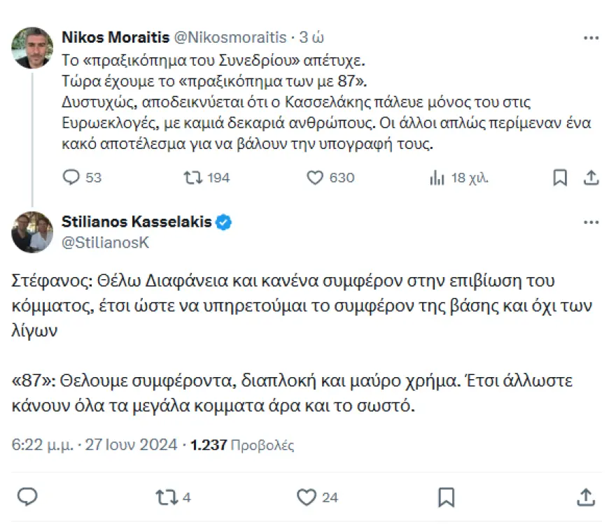 Σε ανάρτησή του στο «Χ» ο αδερφός του Στέφανου Κασσελάκη αντιπαραβάλλει με δική του «μετάφραση» την ανάρτηση του προέδρου του ΣΥΡΙΖΑ για «διαφάνεια και μαύρο χρήμα» με το κείμενο που υπογράφουν 87 στελέχη και βουλευτές του κόμματος, καταλογίζοντάς τους πως θέλουν «συμφέροντα, διαπλοκή και μαύρο χρήμα».