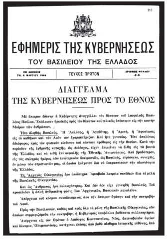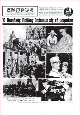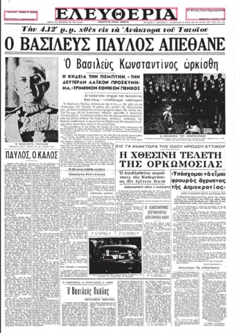 Ο Βασιλεύς Παύλος απεβίωσε στις 6 Μαρτίου.