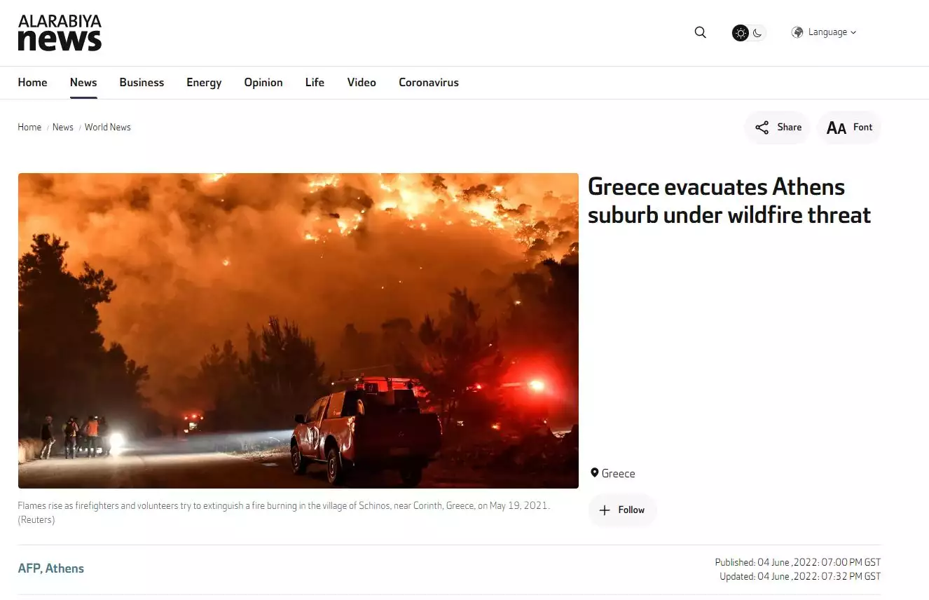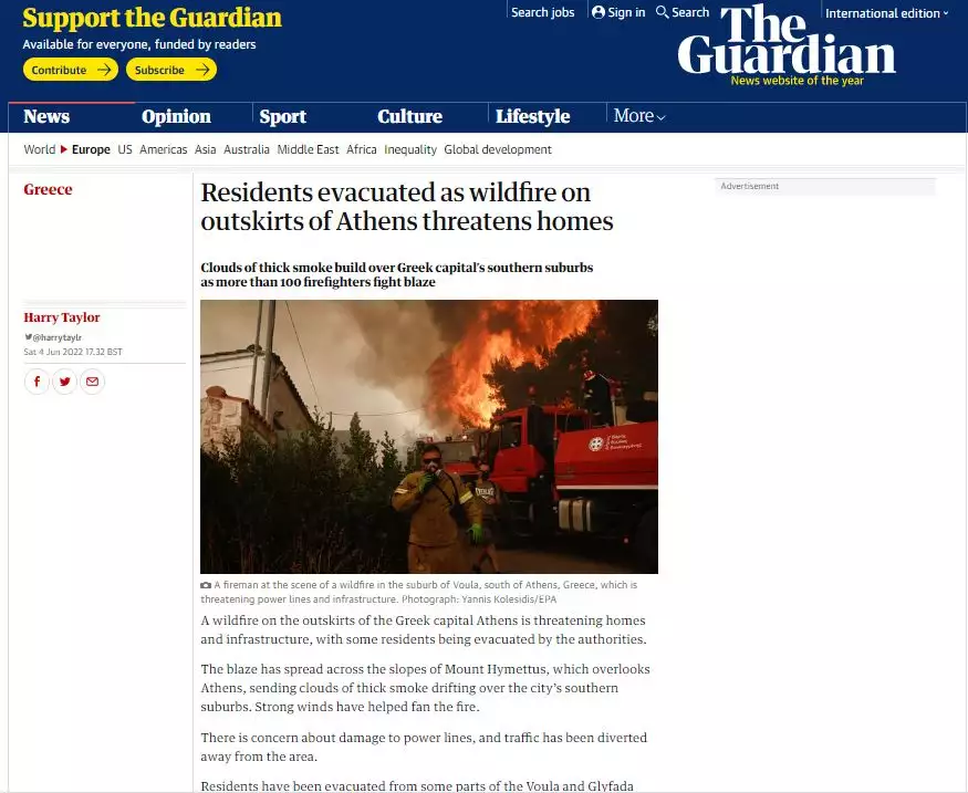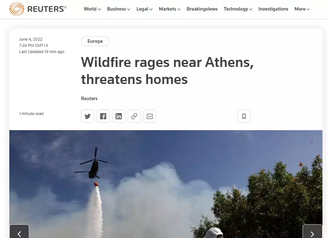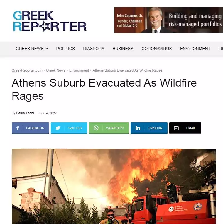 Στα διεθνή ΜΜΕ, έγινε θέμα η μεγάλη φωτιά που ξέσπασε το μεσημέρι του Σαββάτου στην Άνω Γλυφάδα, και γρήγορα εξαπλώθηκε μέχρι και το Πανόραμα της Βούλας.