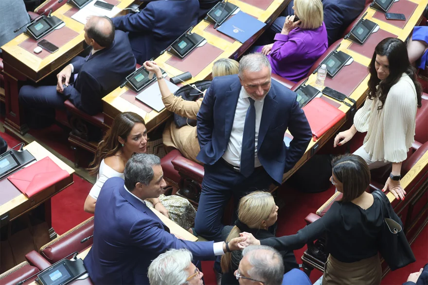 Ο πρόεδρος της Βουλής Κωνσταντίνος Τασούλας, πριν καθίσει στη θέση του, πέρασε από τα έδρανα των βουλευτών, κρατώντας μάλιστα τον Κανονισμό της Βουλής ανά χείρας.
