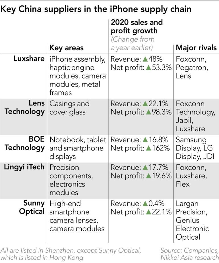Άλλες αξιοσημείωτες εταιρίες από την Κίνα που έχουν εισέλθει στην αλυσίδα προμηθευτών της Apple και αυξάνουν διαρκώς το ποσοστό τους είναι οι Lens Technology, BOE Technology, Lingyi iTech και Sunny Optical.