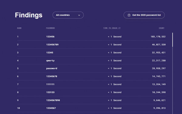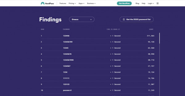 Από τους 200 πιο χρησιμοποιημένους κωδικούς πρόσβασης του NordPass για το 2021, τις τρεις πρώτες θέσεις καταλαμβάνουν τα: 123456, 123456789 και 12345.