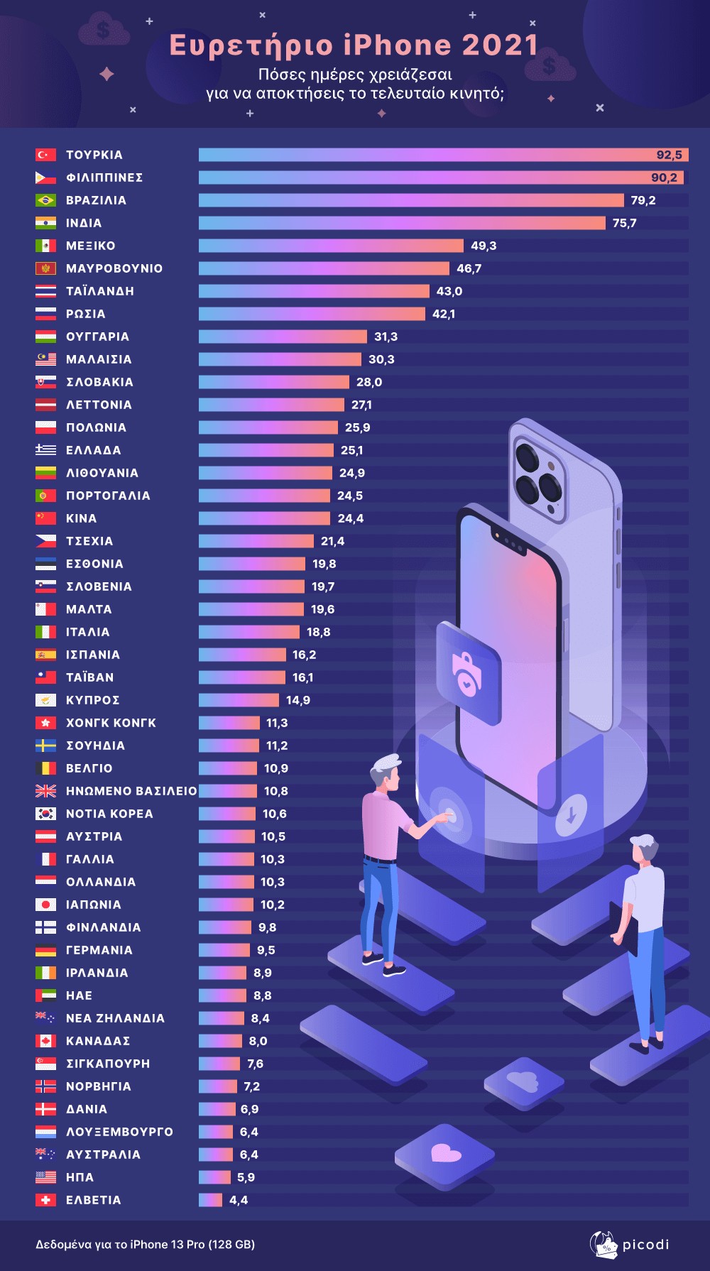 Σύμφωνα με το picodi που έκανε την μελέτη, υπολογίστηκε η τιμή του iPhone13 με μνήμη 128ΜΒ, και το κατά μέσο όρο κατά κεφαλήν εισόδημα.