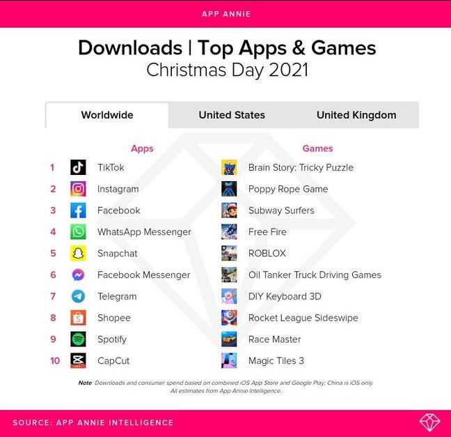 Οι επιτυχίες για το TikTok δεν σταματούν εδώ, καθώς σύμφωνα με την App Annie, την εταιρεία δεδομένων και αναλυτικών στοιχείων κινητής τηλεφωνίας, δήλωσε ότι στις 25 Δεκεμβρίου, σε όλο το τον κόσμο, το TikTok ήταν το πιο ληφθέν μέσο σε iOS και Google Play. Αυτό σημαίνει ότι όλο και περισσότεροι αποκτούν στα κινητά τους τηλέφωνα τη δημοφιλή εφαρμογή.