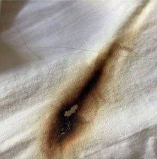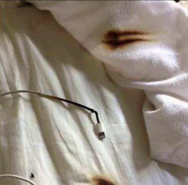 Στις φωτογραφίες βλέπουμε το μολύβδινο άκρο ενός φορτιστή που φαίνεται να έχει λιώσει όλη την προστατευτική του επίστρωση. Από εκεί, περνάει στο σεντόνι και στο άλλο κάλυμμα, δίνοντας την εικόνα για τη ζημιά που μπορεί να γίνει.
