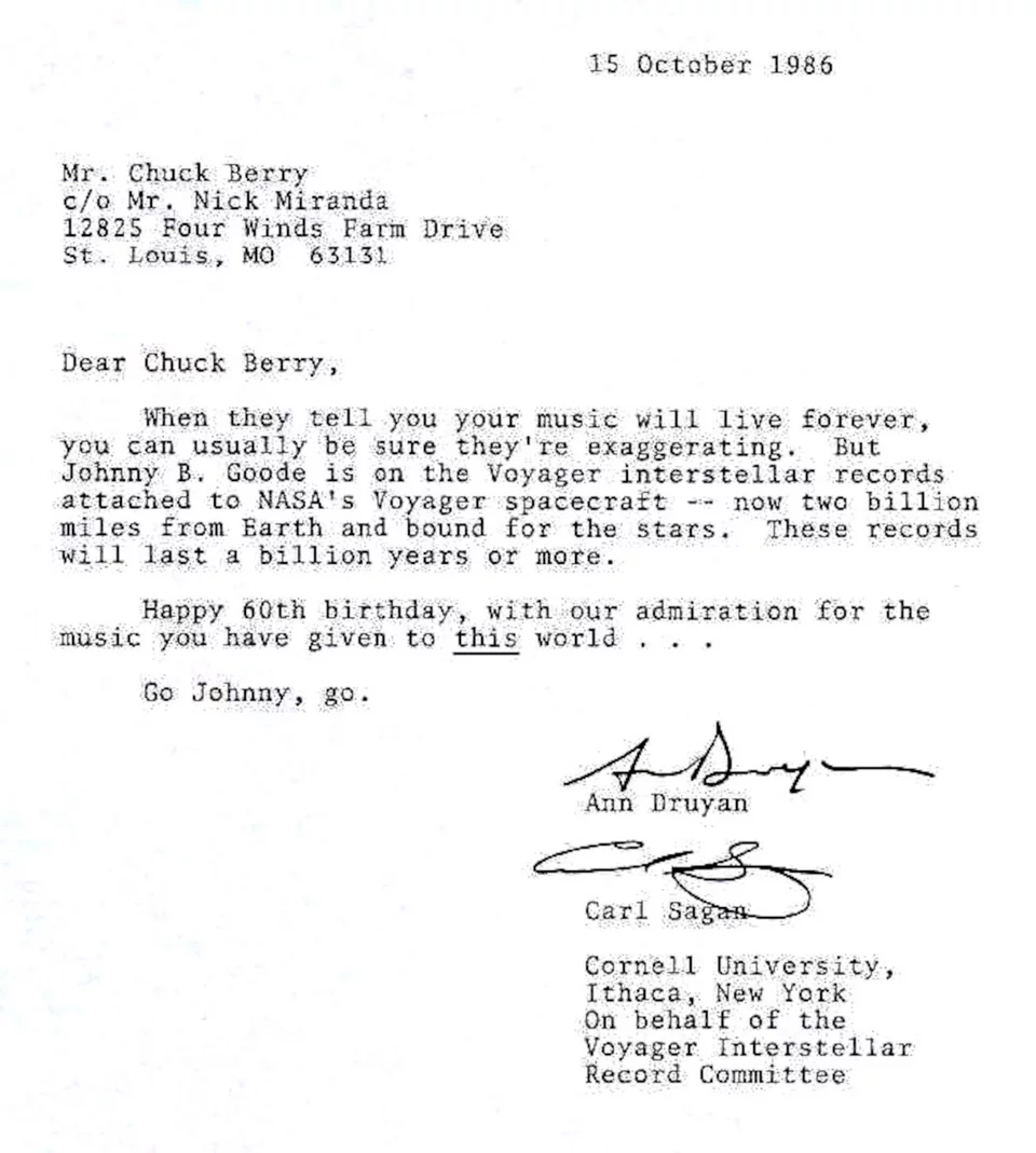 Το 1986 και την ημέρα των γενεθλίων του, ο Chuck Berry έλαβε επιστολή από τον Carl Sagan που του ευχόταν για τα 60 του χρόνια και θυμίζοντάς του ότι το τραγούδι του το Johnny B. Goode ταξίδευε προς τα άστρα.