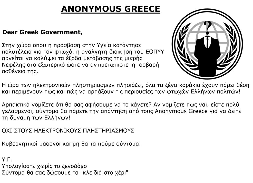 Ωστόσο, οι Anonymous Greece δεν έμειναν σε αυτό… Έστειλαν ένα πολύ σκληρό μήνυμα στην ελληνική κυβέρνηση ενώ επέστρεψαν με νέες απειλές πριν από λίγη ώρα, αυτή τη φορά προς την Τράπεζα Ελλάδος.