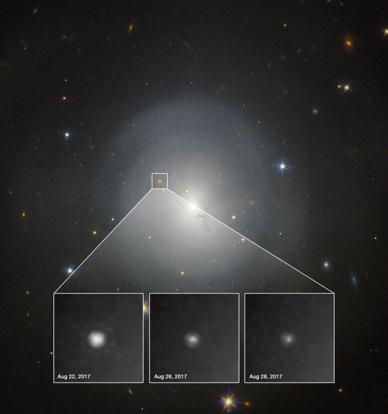 Στη συνέχεια, δεκάδες τηλεσκόπια ειδοποιήθηκαν να στρέψουν τα «μάτια» τους προς εκείνη την κατεύθυνση. Μετά από 12 ώρες, εντοπίσθηκε ένα νέο φωτεινό σημείο -που δεν υπήρχε έως εκείνη τη στιγμή- στον γαλαξία NGC4993, σε απόσταση 130 εκατομμυρίων ετών φωτός από τη Γη. Το εύρημα επιβεβαιώθηκε και από πολλά άλλα τηλεσκόπια, μεταξύ των οποίων από το διαστημικό Hubble και τα επίγεια του Ευρωπαϊκού Νοτίου Αστεροσκοπείου (ESO) στη Χιλή.