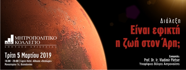 Η Πολυτεχνική Σχολή του Μητροπολιτικού Κολλεγίου Θεσσαλονίκης, η πρώτη και πληρέστερη ιδιωτική Πολυτεχνική Σχολή στην Ελλάδα, διοργανώνει διάλεξη με ελεύθερη είσοδο για επαγγελματίες, φοιτητές, μαθητές όλων των βαθμίδων αλλά και το ευρύ κοινό με θέμα: «Είναι εφικτή η ζωή στον Άρη»;