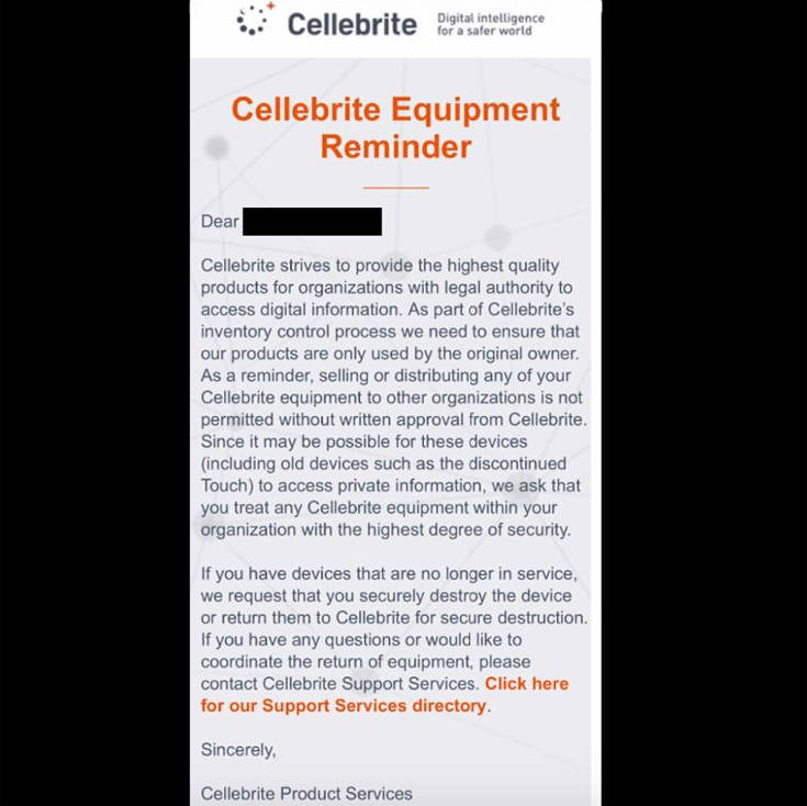 Η Cellebrite δεν είναι ευχαριστημένη με το γεγονός ότι οι μεταχειρισμένες αυτές συσκευές της πωλούνται με τέτοια άνεση στην αγορά. Μάλιστα, την περασμένη Τρίτη, δύο πηγές από τη βιομηχανία εγκληματολογίας προώθησαν στο Forbes μια επιστολή που καταδεικνύει πόσο επικίνδυνη για τα προσωπικά δεδομένα είναι η μεταπώληση αυτών των εξαιρετικά δημοφιλών συσκευών χακαρίσματος.