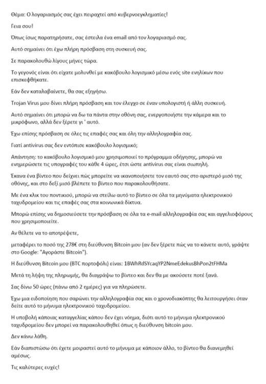Προσοχή σε εκβιαστικά e-mail για καταγραφή προσωπικών στιγμών – Δείτε το μήνυμα που σας στέλνουν και ζητούν χρήματα!