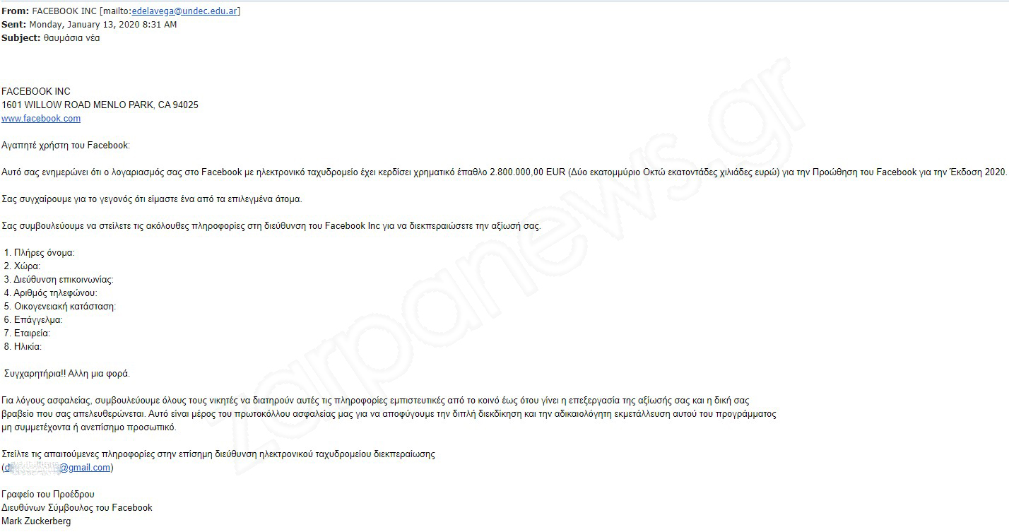 Το συγκεκριμένο κείμενο που ήρθε σε mail ιδιοκτήτη Χανιώτικης επιχείρησης, παρουσιάζεται λες και έρχεται από το facebook, ενημερώνει ότι ο κάτοχος του συγκεκριμένου mail αποστολής και χρήστης της σελίδας κέρδισε 2,8 εκατομμύρια ευρώ, ενώ στο τέλος υπογράφει και ως ο ιδιοκτήτης και ιδρυτής της εταιρείας… Mark Zuckerberg!