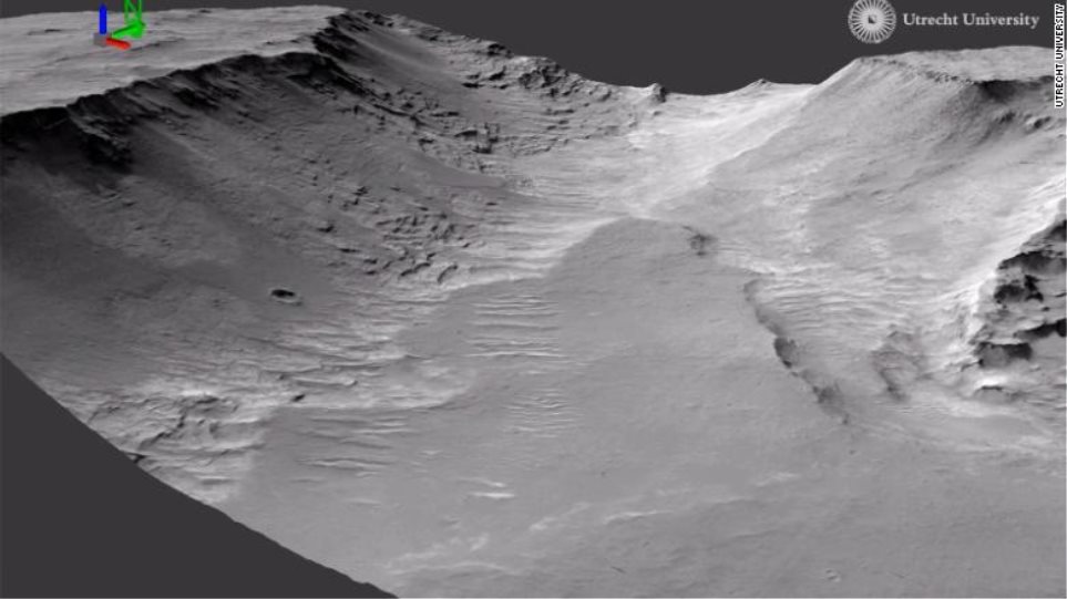 Οι εικόνες επέτρεψαν στους επιστήμονες να «διαβάσουν» τα υποκείμενα πετρώματα και να κάνουν τρισδιάστατες αναπαραστάσεις τους, καταλήγοντας στο συμπέρασμα ότι μια βαθιά χαράδρα στη βορειοανατολική άκρη της μεγάλης λεκάνης Hellas (Ελλάς) σχηματίστηκε βαθμιαία από τη ροή ενός αρχαίου ποταμού. Καθώς ο ποταμός κυλούσε, εναπόθετε ιζήματα σε διαδοχικά στρώματα.
