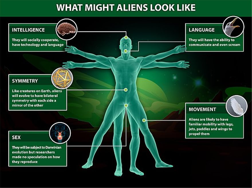Οι εξωγήινοι θα είναι πιθανόν ανθρωπόμορφοι ή ζωόμορφοι, θα έχουν συμμετρικπά σώματα, με χέρια, πόδια, αυτιά και μάτια. Η Δαρβινική θεωρία της φυσικής εξέλιξης και επιλογής δεν είναι δυνατόν, με βάση τους φυσικούς νόμους, να διαφοροποιηθεί, έστω και σε άλλο αστρικό σύστημα, γαλαξία, ή πλανήτη με διαφορετικά χαρακτηριστικά.