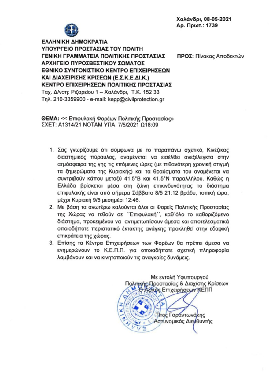 Η Υπηρεσία Πολιτικής Αεροπορίας, εξέδωσε NOTAM, για τον κινέζικο πύραυλο, ο οποίος αναμένεται να εισέλθει ανεξέλεγκτα στην ατμόσφαιρα της γης τις επόμενες ώρες (με πιθανότερη χρονική στιγμή τα ξημερώματα της Κυριακής).
