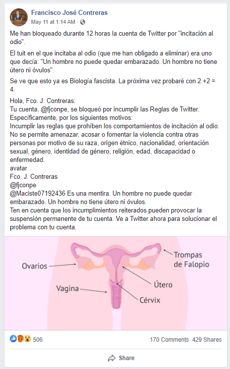 Ο Φρανσίσκο Χοσέ Κοντρέρας, Ισπανός βουλευτής «μπλοκαρίστηκε» από το Twitter την περασμένη εβδομάδα επειδή ισχυρίστηκε το προφανές: ότι “ένας άντρας δεν μπορεί να μείνει έγκυος”.