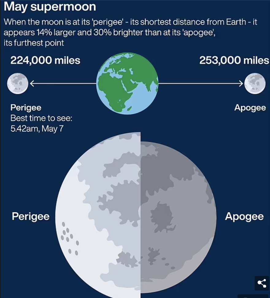 Η πανσέληνος θα φθάσει στην κορύφωση της λίγο μετά το μεσημέρι της Τετάρτης 26 Μαΐου, αλλά μερικές ώρες νωρίτερα, το βράδυ της Τρίτης 25 Μαΐου (περίπου στις 04:30 ώρα Ελλάδας της 26ης Μαΐου) η Σελήνη θα βρεθεί στην κοντινότερη απόσταση της από τη Γη (357.311 χιλιόμετρα).