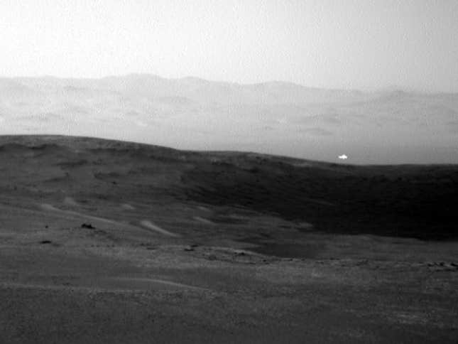 Το ρόβερ τράβηξε μια ασπρόμαυρη φωτογραφία, μπροστά από ένα βραχώδες τοπίο. Στη φωτογραφία, μια μακριά και ακανόνιστη λευκή λάμψη φαίνεται να περνάει από πάνω.