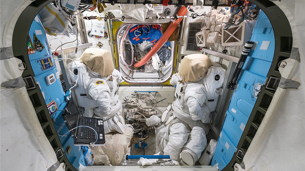 Οι δυο τους τράβηξαν καταπληκτικές φωτογραφίες: έναν ωκεανό με πέπλο από σύννεφα, τους λαβυρίνθους καλωδίων που είναι «στρίφωμα» στα εσωτερικά τοιχώματα του σταθμού, στολές και κράνη των αστροναυτών αφημένα σε σημεία για να χρησιμοποιηθούν.