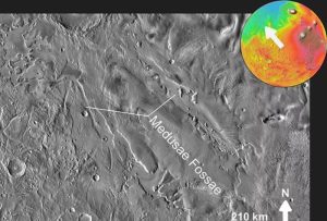 Ο Σχηματισμός Medusae Fossae είναι μια συλλογή από τεράστιες αποθέσεις που εκτείνονται για περίπου 5.000 χιλιόμετρα (3.107 μίλια) κατά μήκος του ισημερινού του Άρη, σηματοδοτώντας το όριο μεταξύ των πεδιάδων στο βόρειο ημισφαίριο και των υψίπεδων με κρατήρες στο νότο.